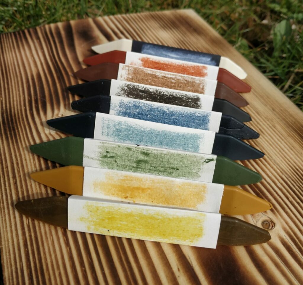Ma gamme complète de crayons de couleurs à la cire naturelle (cires végétales et cire d’abeille) et aux pigments minéraux et végétaux est visible ci-dessous. D’autres coloris sont en préparation pour cet hiver (rose, violet, orange…) !