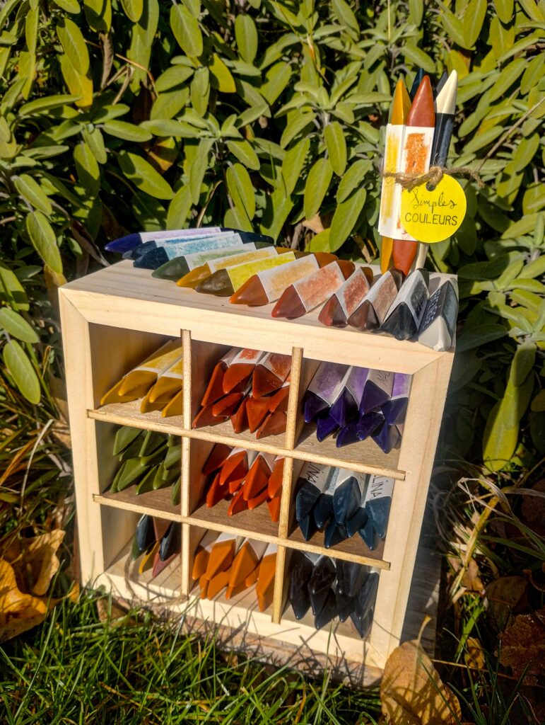 Ma gamme de crayons de couleurs à la cire naturelle (cires végétales et cire d’abeille) et aux pigments minéraux et/ou végétaux est visible ci-dessous :