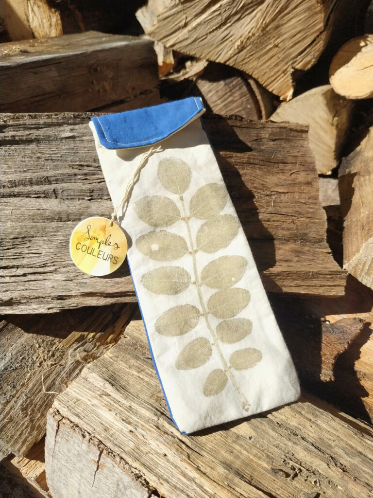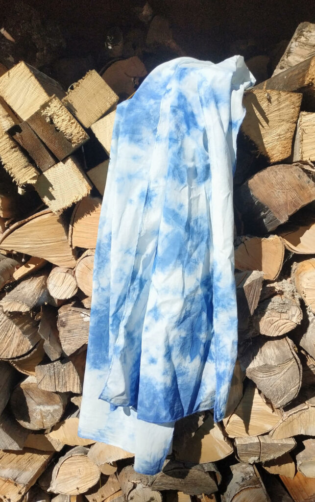 Les teintures sont 100% naturelles, végétales et avec un usage raisonné de minéraux comme l’alun ou le fer pour le nuançage ou le mordançage. Je créé également des accessoires cousus avec les tissus teints ou avec des impressions végétales obtenues par empreinte directe, c’est-à-dire que la plante est martelée directement sur le tissu, ou encore à partir de tissus teints en cuve d’indigo avec réserves (techniques inspirées du shibori).